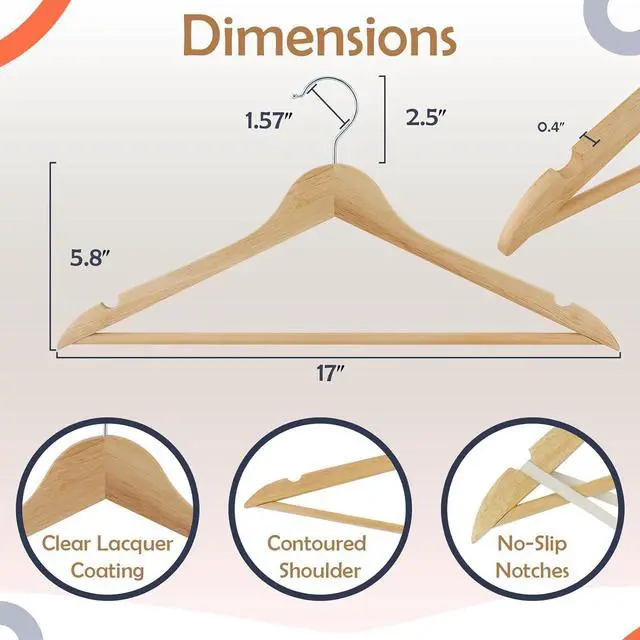 WHAT YOU GET: The dimensions 17" x 8.3 " x 0.4 ", value set of 20. Packaged by hard carton to prevent wooden suit hangers breaking! Friendly customer service and 100% satisfaction for your requirements. If for any problem about our wooden clothes hangers please contact us.