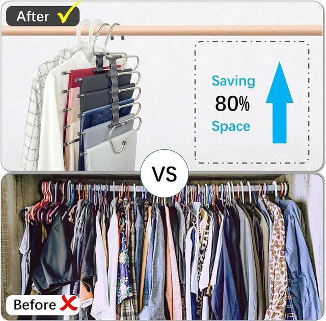 SPACE SAVING PANTS HANGERS: 5 tier trousers hangers. Each hanger can at least hold up 5 jeans, trousers or other clothing. Maximize to save your closet space and keep it clean and orderly. Strong bearing strength and won' t be easy to be out of shape