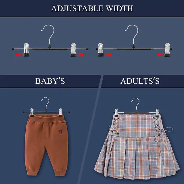 Skirt Hangers Adjustable Clips: Skirt hangers with clips come with 2 adjustable clips, you can move the Skirts hangers to fit different sizes of pants, skirts, jeans, shorts, scarf, underwear, socks, Towel, hat, tie