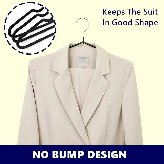 No Bump DesignThe super non-slip rubber coating keeps your clothes in natural shape without shoulder bump and prevents slipping or falling down, great for hanging jackets, pants, shirts, dresses, and more, strong enough for hanging heavy coat.