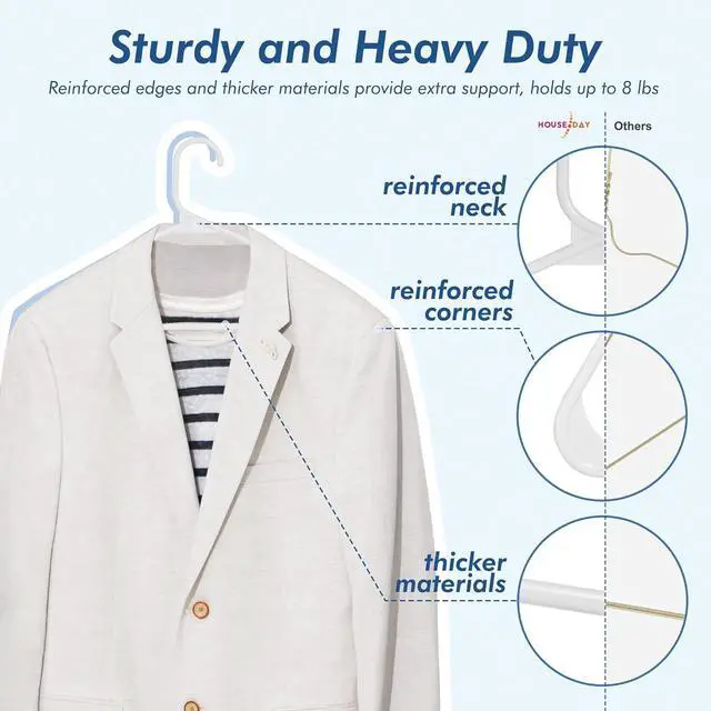 Storage: Keep your closet neat and tidy with these plastic clothes hangers 50 pack! These white plastic hangers allow you to arrange your garments in a systematic and efficient manner, ensuring that finding and retrieving your desired clothes is a breeze. Additionally, the elegant design of the closet hangers also enhance the visual appeal of your storage space.