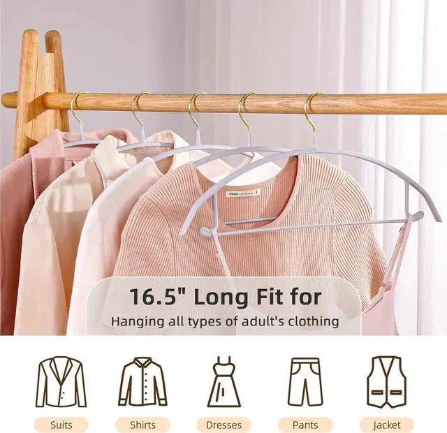 NO SHOULDER BUMP ROUNDED HANGERS: Looking for coat, sweater, or shirt hangers that don' t leave lasting bumps? Hangers 20 pack has an ergonomic design with curved shoulders to keep garments wrinkle free and retain their original shape. It has a bar at the bottom to hang your pants or skirts. There are grooves or hooks on the side to hang your spaghetti strapped clothing.