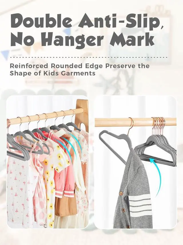 Non Slip Small Velvet Hangers: Unlike plastic or metal hangers, the velvet child hangers made of luxurious velvet and improved high-grade ABS plastic, can hold up to 10 lbs; These childrens hangers for clothes will hold even the heavy coats or jeans securely in your kid' s closet, making your baby room decor more elegant and tidy