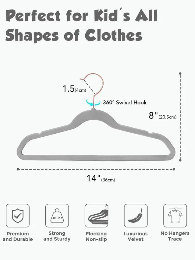 Space Saving Sturdy Kids Hangers: The sturdy and ultra thin design of the velvet kids grey hangers maximizes storage space and fully utilizes your baby closet; Increasing closet space by up to 75%; Ideal size and lightweight for each velvet hangers kids: 14" L x 8" H x 1/4" thickness