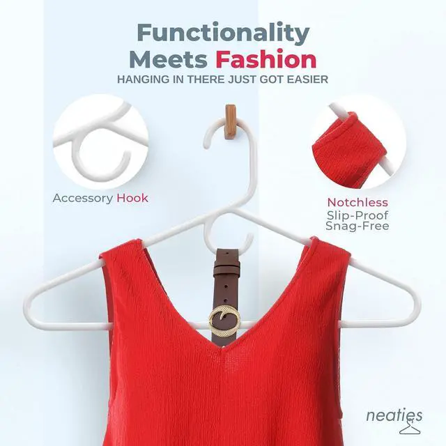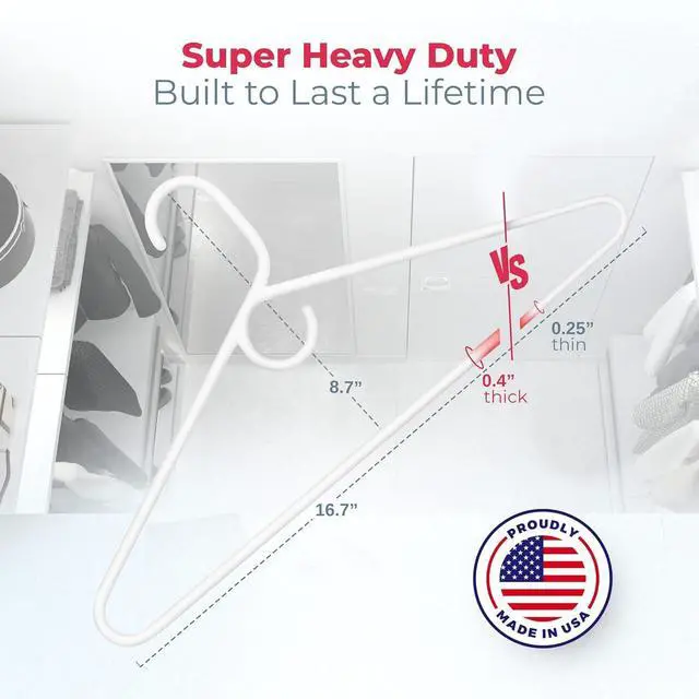 QUALITY and SLIM DESIGN - These plastic clothes hangers are made using high quality and safe material. Our customers deserve the best. Unlike wood hangers, velvet hangers, metal hangers, wooden hangers, and other foreign-made plastic hangers, these heavy duty plastic hangers will last for decades. These slim hangers include a hook and bar feature for scarves, belts, ties, and accessories.
