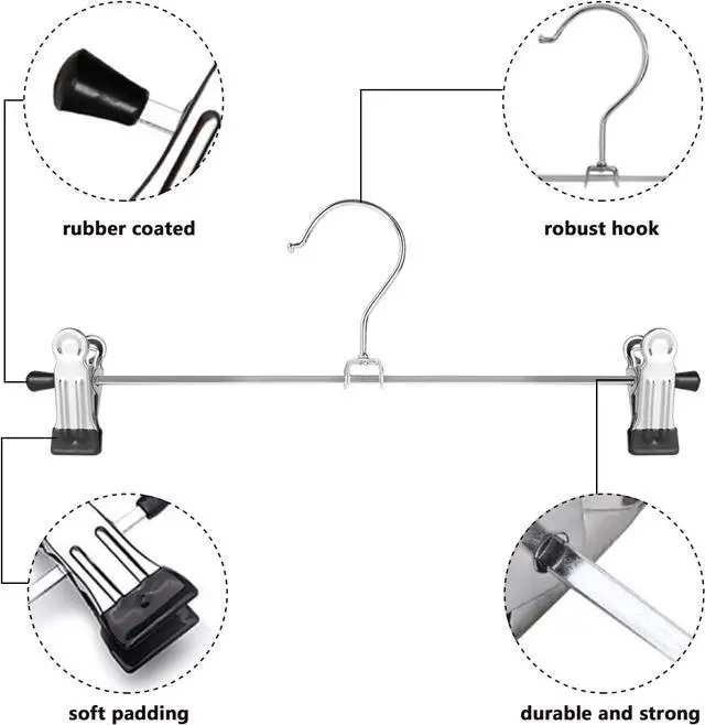 Trouser hanger with great grip force: Amazing hangers for skirts with rubber protected is with great grip clip to grap clothes to avoid falling down. What' s more, pants hangers with clips coated prevent leaving metal mark on clothing.