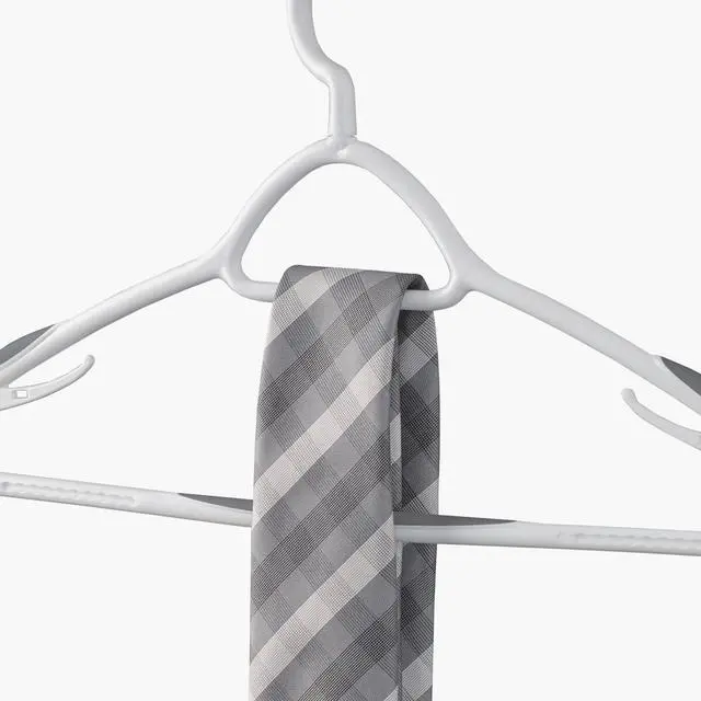 INCREASED HANGING POTENTIAL - Packed with design features to help you free up valuable storage space in your drawers, each hanger features built-in space saving hanger hooks, an accessories bar and pants bar.