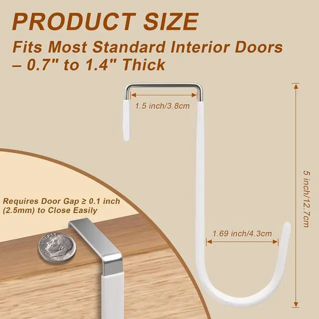 Door Hooks: Made of thick rust-resistant metal with a soft rubber coating each over the door hook supports up to 20 lbs without bending or slippingideal towel hooks for bathrooms robes backpacks coats and more. Perfect for hooks for hanging heavy duty needs in any home or dorm room. Fits Most Standard Doors Please Check Door Gap: Designed to fit interior doors from 0.7 to 1.4 thick. For proper use please ensure there is at least 0.1 ( 2.5 mm) clearance between the door and the frame so the door can close smoothly with the hooks installed. (This clearance is about the thickness of a coin and refers to the door gap not the hook itself. )No Drilling Tool-Free Setup Great for