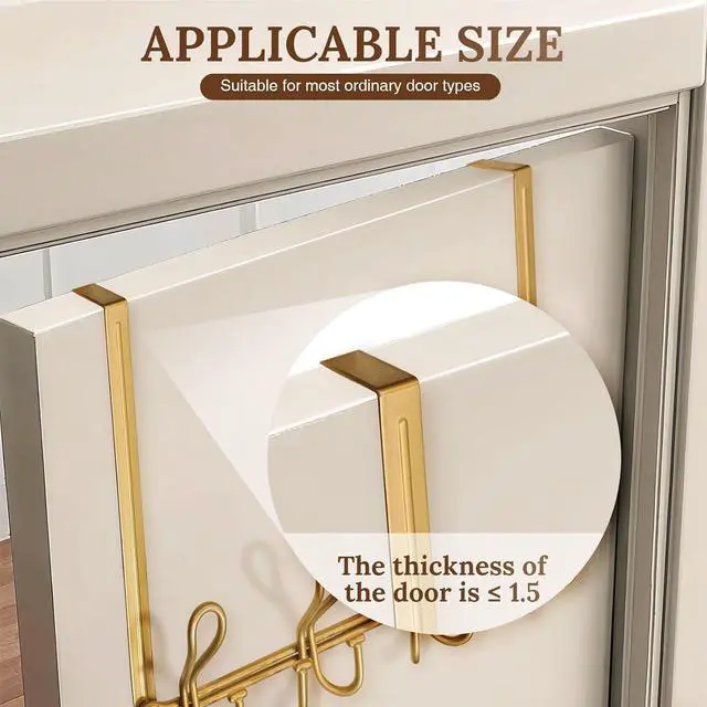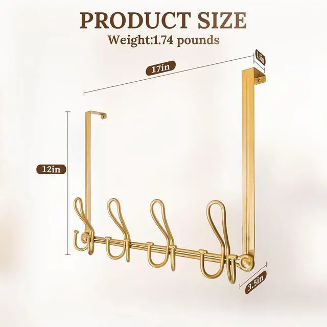The features 12 hooks create instant storage. Ideal for use in closets bathrooms bedrooms and utility areas. The size is 17 x 12 x 3.5 inches weight is 2.4 pounds. It fits the door thickness 1.5 inches. Working capacity is 24 lbs.
