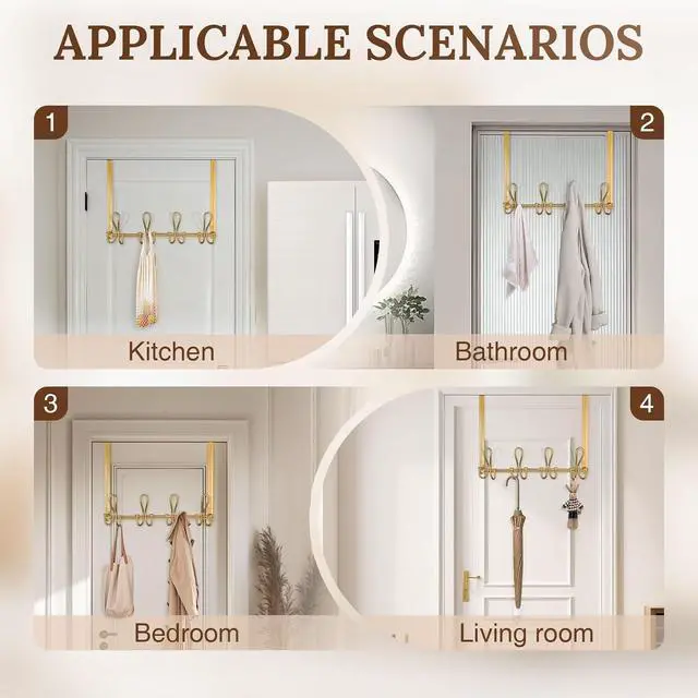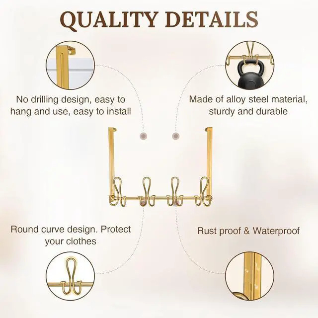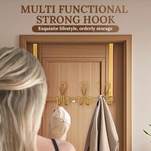 Double Prong Over The Door Hook Rack with 4 Triple Hooks to Hang Your Coats Hats Towels Purses and More in Your Bathroom Bedrrom or Walk-in Closets - Gold