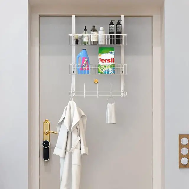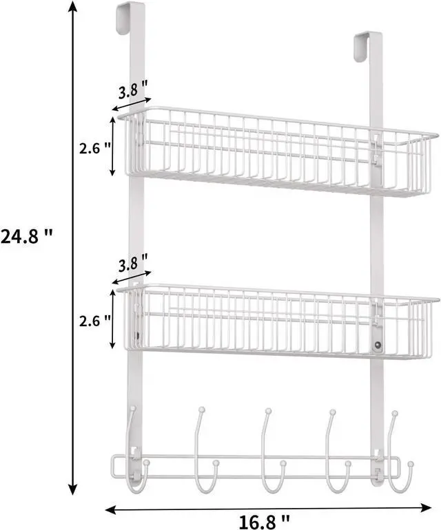 Multifunctional Door Hanger: The simple design over door organizer with 5 coat hooks and 2 mesh baskets to create extra space for your door. Can be used in the bedroom kitchen bathroom study room office and all other places where you need to hang storage. The shape is simple but decorative convenient for your life and make your home neat and orderly.