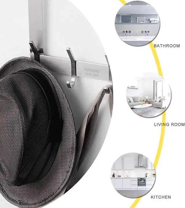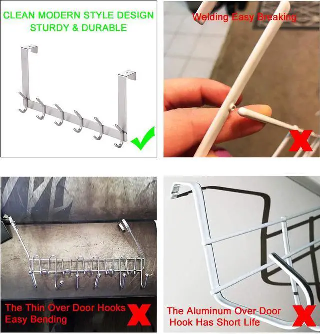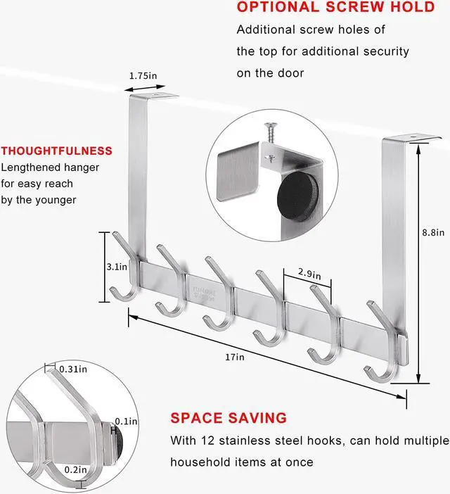 STURDY & DURABLE - The Over Door Hook and the fitting screw is built to last with sturdy 304 stainless steel. It will NOT BEND RUST or tarnish and best of all is built to HOLD UP to 110 LBS. Allowing it to remain looking its best for longer. SPACE SAVING - Perfect decorative hooks for closets bathroom bedroom kitchen and office great for hanging towels robes coats clothes hats keys umbrellas scarfs shopping bags handbags pants kitchen utensils and washcloths sponges etc. It can make your room look more classy and minimalist. CONVENIENTLY SIZED - Measures 17'' wide by 8.8 '' high giving you 12 decorative hooks instead of the usual 6 to securely and safely hang heavy items all while adding to the rooms decor.