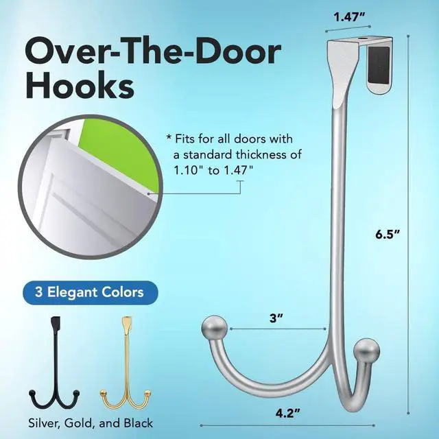 STURDY METAL HOOKS FOR HANGING. Our over the door clothes hanger is made from zinc alloy that can hold up to 20 pounds for each hook ideal as a robe & towel hook for bathroom hat hanger coat hook cubicle hook closet hook & more. SNUG FIT MULTIPLE SPONGE PADS. The versatile design of our 2-head bathroom hooks for towels allows you to mount them on any door sizes up to 1.47 thickness for it includes sponges in varied sizes. These pads makes this hook anti-wobble and anti-scratch to perfectly fit and protect your door surfaces while maintaining stability.