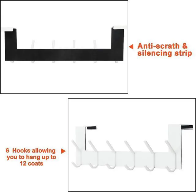 Over the door hook with 6 double hooks; white metal package including 1 x door hook. Keep quiet & prevent scratches door hanger hook with protective pad in back; be sure there enough gap over your door: above 0.056 inches (a coin thick). No Assembly Required & Sturdy coat hooksthe hooks were welded on. over the door coat rack