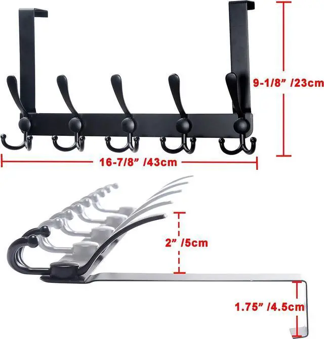 High Quality Metal Door HooksSimple and uchic and 5 metal triple hooks for a truly clean tidy home styles. for 1-3/4'' ThicknessThe folding depth of the rack arm is 1-3/4'' and suit for thickness of the door should be 3.7 - 4.5 cm. SturdyThe stainless steel door coat hook are screwed with 5 triple hooks for quick assembly and then hang on the door. TidyPlenty of coats towels shirts jackets can be organized and stored on the door. Dimensionsabout 43 x 6.5 x 23 cm the hanging height of this rack is 9-1/8 '' (23 cm).