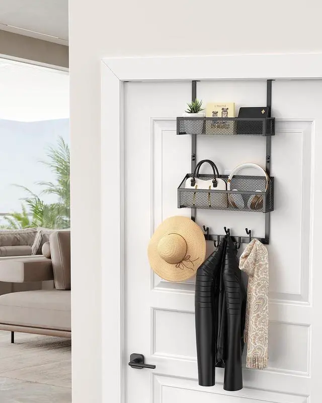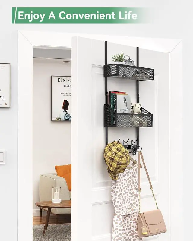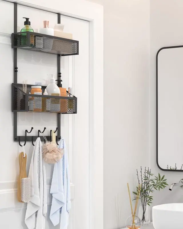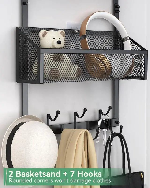 HIGH-QUALITY MATERIAL: Bathroom door hooks made of sturdy iron material coated with high-quality paint on the surface. Over the door organizer equipped with 2 baskets + 7 hooks the hooks are designed with dots to prevent clothes from being scratched.