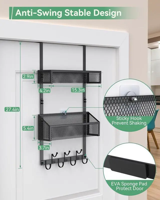 ANTI-SWAY STABILIZING DESIGN: In order to enhance the stability over the door organizer product is equipped with 6 sponge protection pads + 2 sticky hook which can be stably fixed in place not easy to sway and avoid noise when the door hook is knocked.