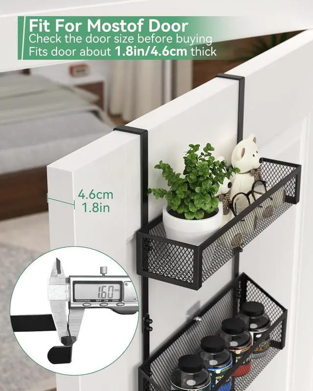 PORTABLE OVER DOOR STORAGE: Bathroom organizer portable design allows you to remove it at any time and move it from the door hanger to any door as needed making storage and life easier. The over the door storage organizer fits most doors and door hooks is suitable for doors with a maximum thickness of 1.8 inches.