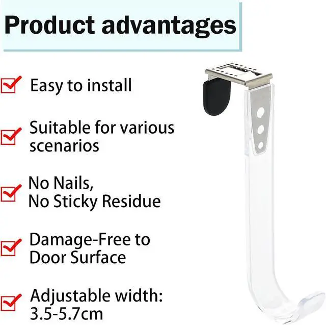 The adjustable bracket also means that the door hook fits several different doors with a depth between about 3.6 cm and 5.5 cm. You adjust the depth of the hook by gently pushing the metal part down on top of the hook. Slide the lock forwards or backwards depending on whether you want the hook to be wider or narrower. Package will come includes 2 pack over the door hooks. The door hook made of durable plastic & Stainless steel.
