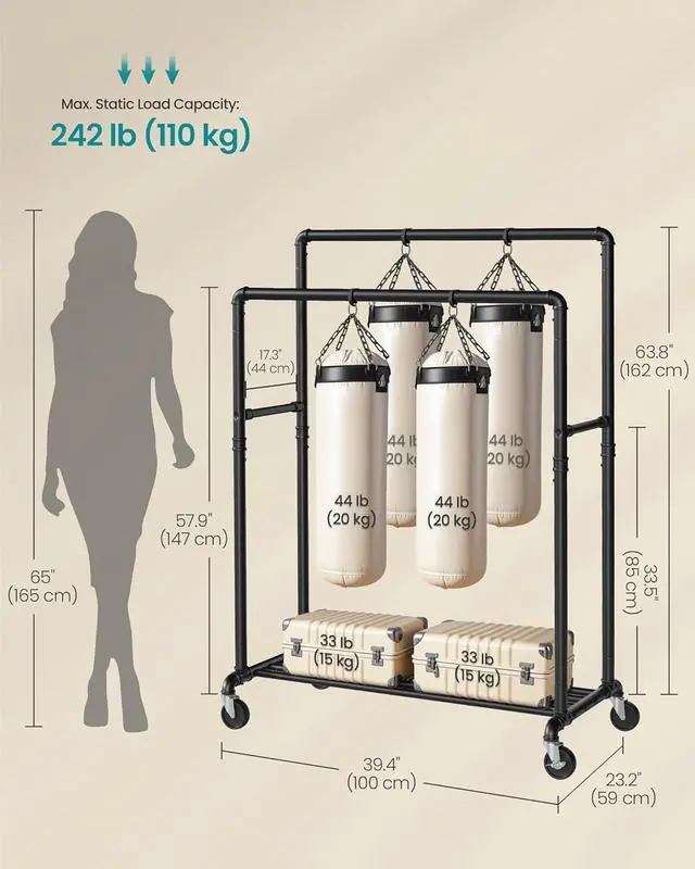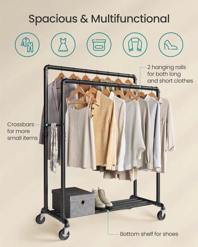 [Lots of Storage] The two 39.4 " long hanging rails that are 17.3 " apart offer lots of space to hang your clothes and keep them easily accessible. The side crossbars can hang bags, hats, scarves, and other accessories