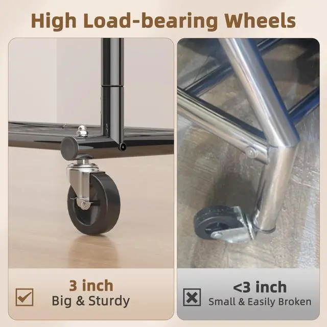 Rolling Smoothly: 3 inch heavy-duty swivel wheels glide effortlessly on floors, tiles, carpets, or concrete. Locking brakes provide stability when stationary, making it easy for you to pick up or hang clothes.