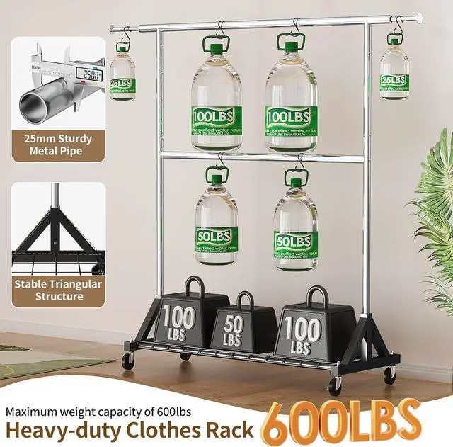 Heavy Duty & Stable Construction: Our heavy duty clothes rack has a max load capacity of 600LBS, built with premium zinc-iron alloy material. It is waterproof, rustproof, and corrosion-resistant for long-lasting durability. The reinforced triangular structure on the sides ensures excellent stability and sturdiness, preventing wobbling.