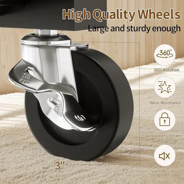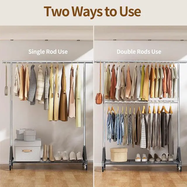 Double Rod & Bottom Shelves: With a double rod design, this rolling clothes rack offers ample space for hanging clothes. If you need to hang heavy coats or dresses, the second rod can be installed at the bottom. The bottom shelves of garment rack also provide convenient storage for shoes, storage boxes, and other items.
