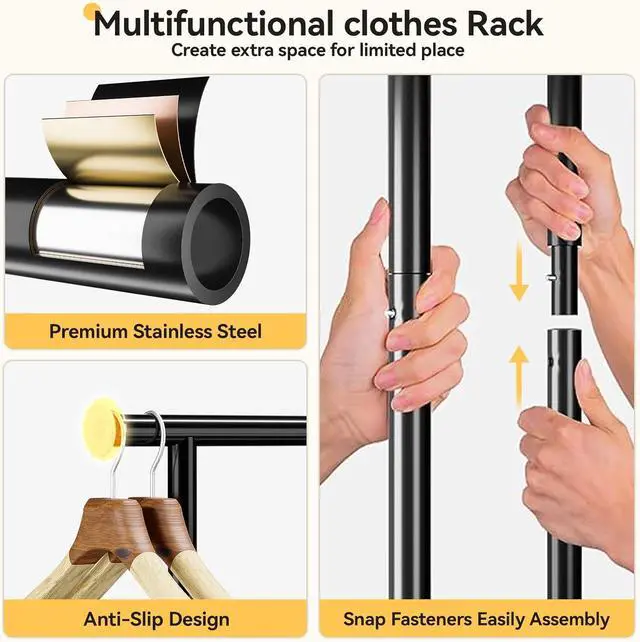 Sturdy & Secure DesignOur heavy-duty clothing rack employs a T-shape structure for optimal support, and seamlessly welded points resulting in a durable structure that withstands a load of up to 150lbs. Say goodbye to wobbly and unstable racks.