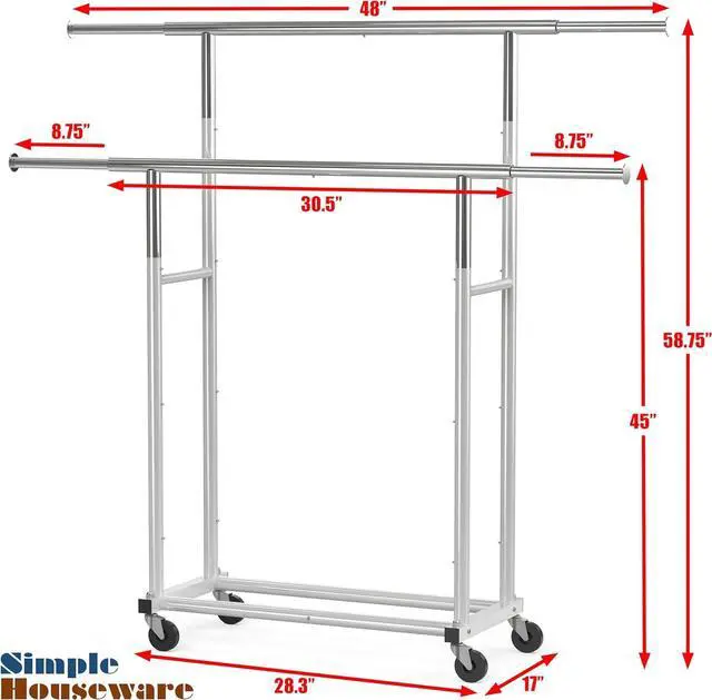 Simple solution for added garment storage. Build with Heavy Duty Steel, Elegant Silver paint and Chrome finish. Sturdy metal construction and easy assembly. Extendable Horizontal Rod from 30.5 " to 48". Dimensions: 17" D x 48" W x 58.75 " H.
