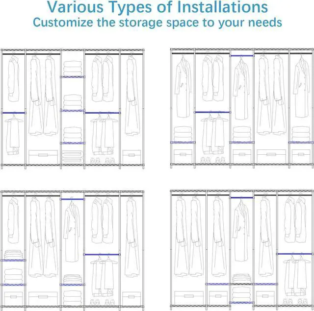 Versatile Flexible Closet: This open wardrobe can be Installed into different ways. It has adjustable shelves and detachable hanging bars so you can customize the storage. L shape for small spaces like corner, apartment, bedroom; Straight-lined shape for walk-in closet and cloakroom clothing store.