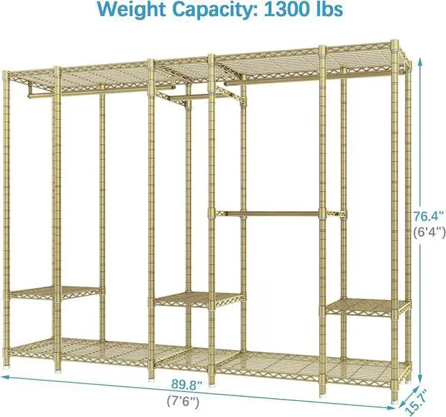 Dimensions & Load Capacity: 89.8 " L x 15.7 " W x 76.4 " H. Load capacity up to 1300 lbs. Single hanging rod can support up to 75 lbs, and wire shelf can support up to 88 lbs for each.