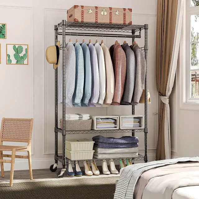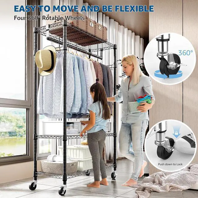 Lockable 360° Wheels And Multifunctional: This rolling clothes rack has 4 heavy-duty rolling wheels, and thus you can easily move anywhere you need, such as the entry closet, laundry room, hallway, balcony, bedroom, cloakroom, bathroom, garage, and more. And 2 of them are lockable, which ensures more safety