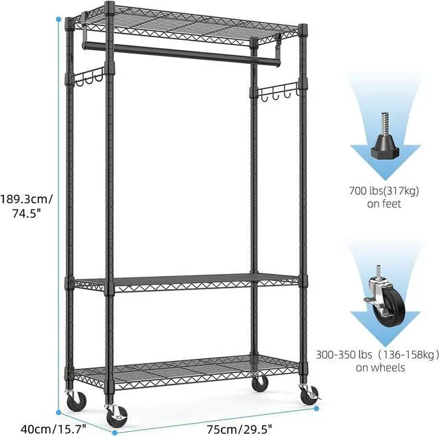 Dimension And Capacity: With its dimensions of 15.7 " D x 29.5 " W x 74.5 " H, the clothes rack has a total weight capacity of 750 pounds on feet and roughly 300-350 pounds when it is with wheels