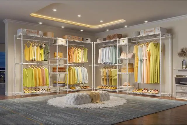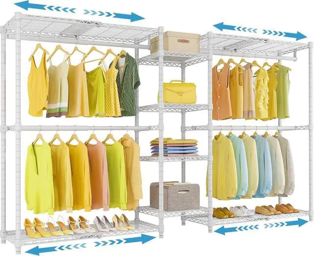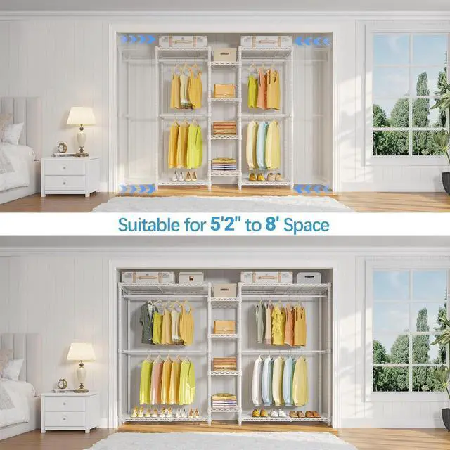 Maximize Your Space: With 4 expandable closet shelves and 4 extendable hanging rods, VIPEK X3 freestanding closet rack adjustable from 5' 2" to 8' befitting a large space. It provides flexible solutions for you to maximize storage in a limited location to make full use of your space