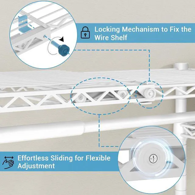Flexible Adjustment & Secured Locking: All the wire shelves and hanging rods can be lengthened or shortened (24" to 41" ) based on your needs. They are equipped with secured locking gadgets, eliminating the annoyance of overextending