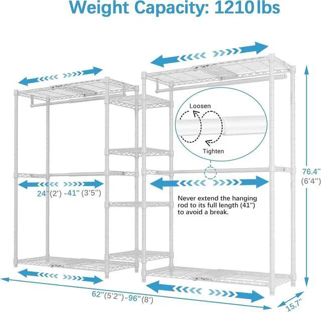 Dimensions & Load Capacity: (62" -96" )W x 15.7 " D x 76.4 " H, X3 clothing rack maximum load capacity 1210 lbs., constructed of high-quality carbon steel, sturdy and reliable, it is long-lasting and features anti-tip devices to prevent unexpected falling