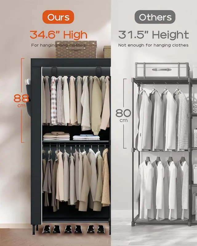 [Extra Large Capacity] This portable closet measures 54.7 " L x 17.7 " W x 78" H, with three hanging rods and multiple shelves, it can meet your daily clothes storage needs. Raised hanging height ( 34.6 inches for short clothes, 52 inches for long clothes) keeps your shirts, jackets, and skirts wrinkle-free!