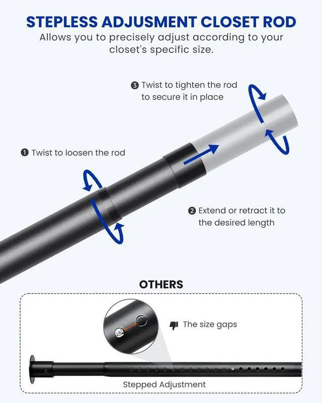 Stepless Adjustment Closet Rod: The upgraded Supforce closet rod features the stepless adjustment design, allows you to precisely adjust according to your closet' s specific size; Without any size gaps, No manual cutting is required.