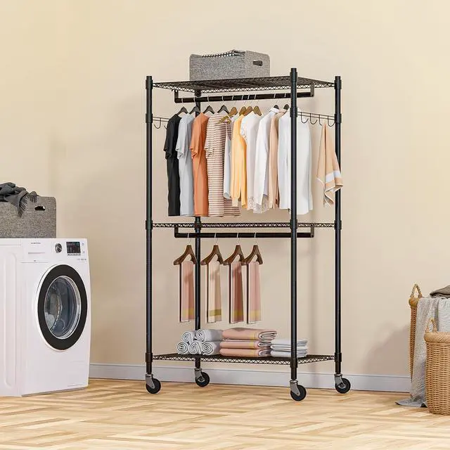 Strong Storage Capacity 3 Tiers clothes racks and 2 hanging rods offers you various storage area. The shelves can be adjusted up and down, or remove for your needs, to store difference sized items. Easily maximize your storage space by providing shoes storage, hang storage, folded storage