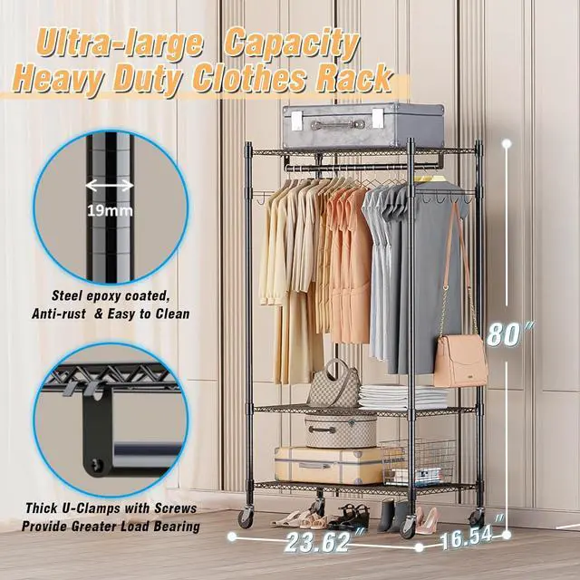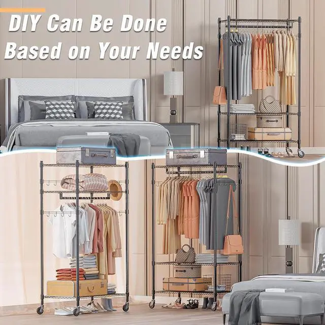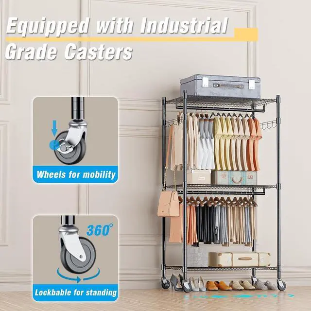 LOCKABLE 360° WHEELS Equipped with 4 rolling wheels, 2 of them are locking wheels, designed to allow you to roll this clothing garment rack where ever you need in home. Easy access to bedroom, cloakroom, clothing store, laundry room, walk-in closet and more