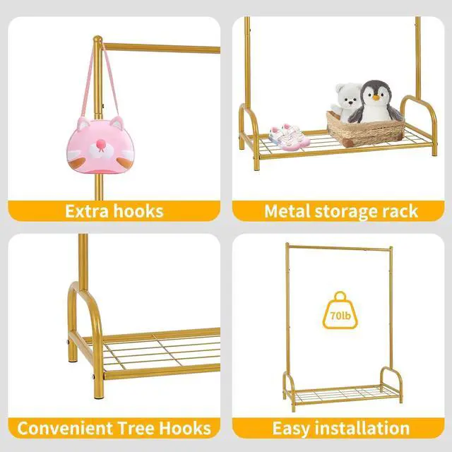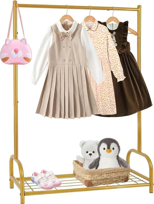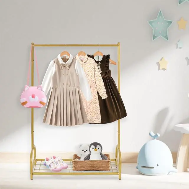 Enhanced Storage SpaceThis baby clothes rack is equipped with a bottom metal storage shelf, perfect for storing shoes, toys, and storage bins. Compared to fabric storage racks, it is more sturdy, stable, and adds a touch of quality.