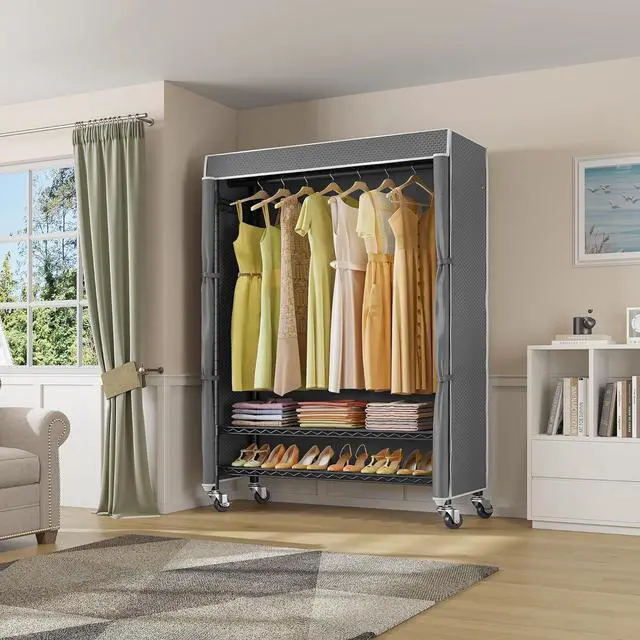 Movable Closet for Multiple ScenariosThe rolling hanging clothes rack is designed with four 360°movable wheels( 2.5 " ), including 2 lockable wheels, which can support it to stable and not slipping. Suitable for using in multiple scenarios, such as laundry room, hallway, balcony, bedroom, cloakroom, bathroom, entry closet.