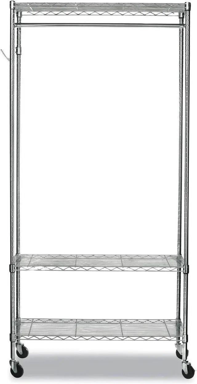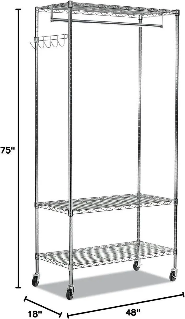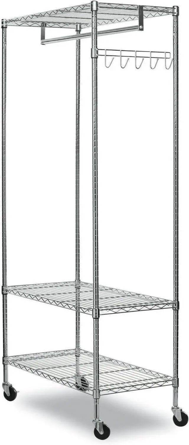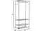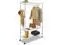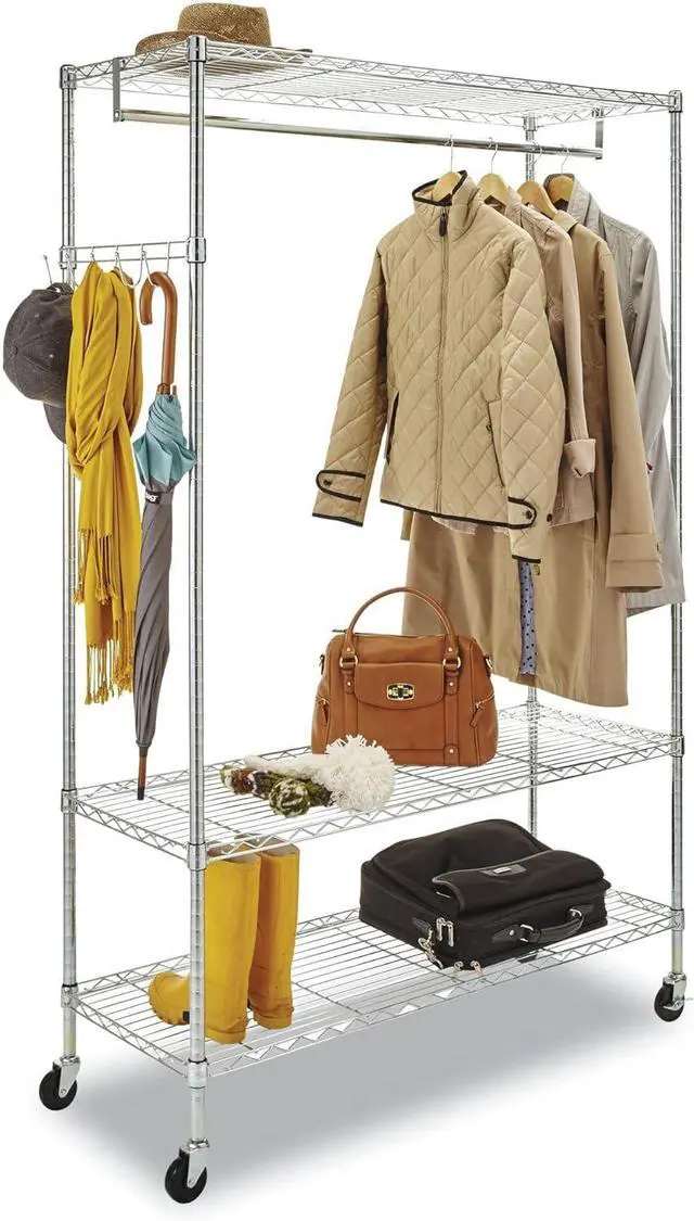 Rack includes hanging rod for garments, and five support hooks for umbrellas, bags, and other items.