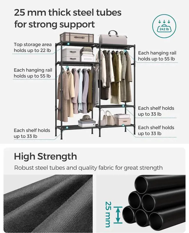 [Stable, Sturdy, Strong] With 25 mm dia. steel tubes, premium non-woven fabric, and sturdy connectors, this garment rack ensures long-lasting stability and support (total max. load 242 lb)