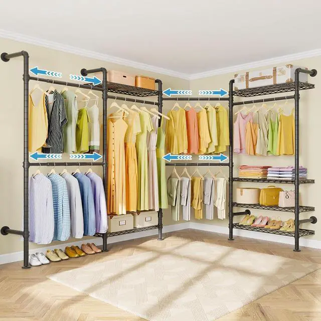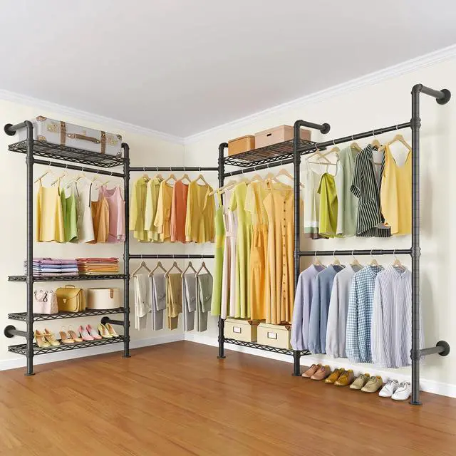 Multifunctional Storage Closet -- Wall clothing rack L shaped can fit variety of you needs as an industrial corner wardrobe rack, hanging corner clothes rack, valet stand, coat stand, toilet rack bathroom shelf or wall hanger for clothes storage rack in the bedroom, living room, laundry room, retail store, washroom, bathroom