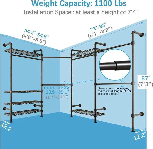 Maximize Your Space -- Wall-mounted garment rack for corner with top shelves and 4 expandable closet bars providing an integrated solution for you to maximize storage in a confined space. (Dimension of wall pipe closet: 98 " -126 " x 12.2 " x 87 " ). Adjustable from 6 to 8.2 Ft