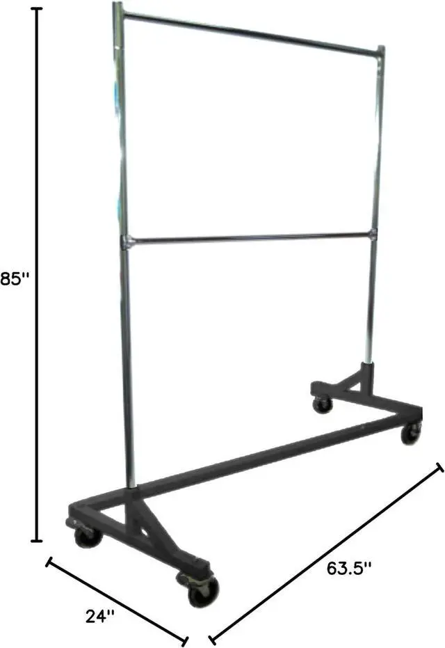 GR600-EH Deluxe Commercial Grade Rolling Z Garment Rack, 400lb Capacity, 63" Length with Add-On Extra Double Rail, Adjustable Height Chrome Uprights and Black Base, One Rack