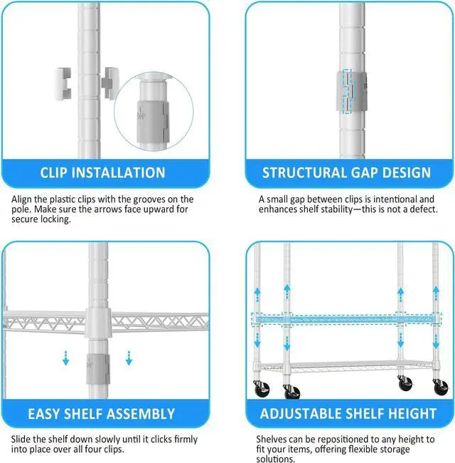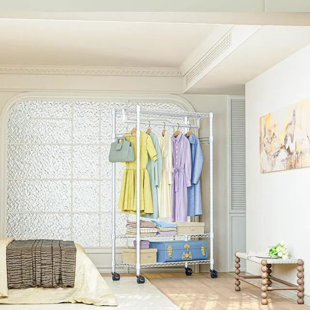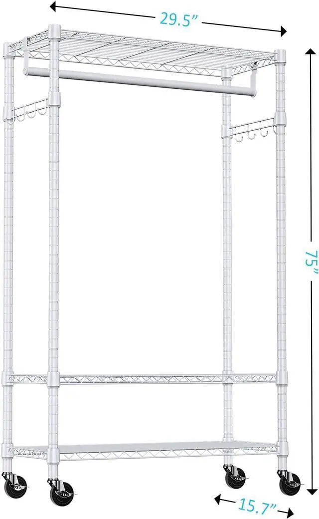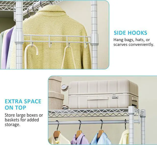 Spacious Adjustable Storage Features 3 adjustable wire shelves, a sturdy hanging rod, and side hooks, allowing you to customize storage for clothes, shoes, bags, and more.