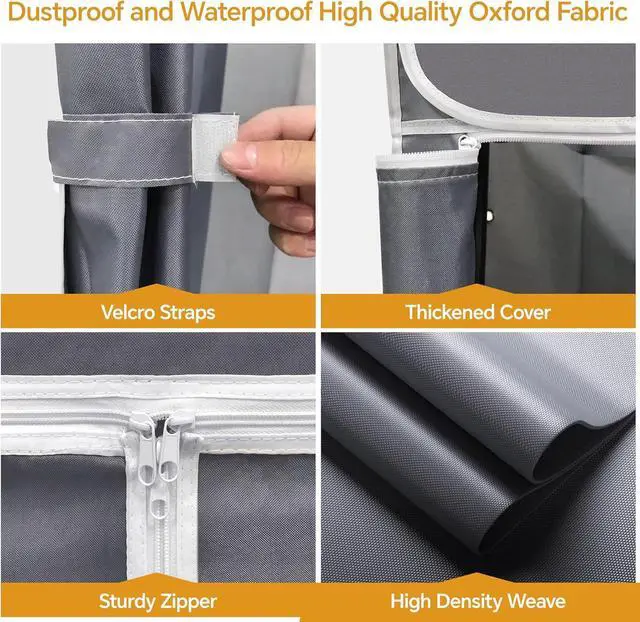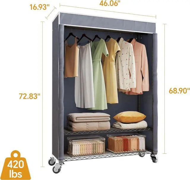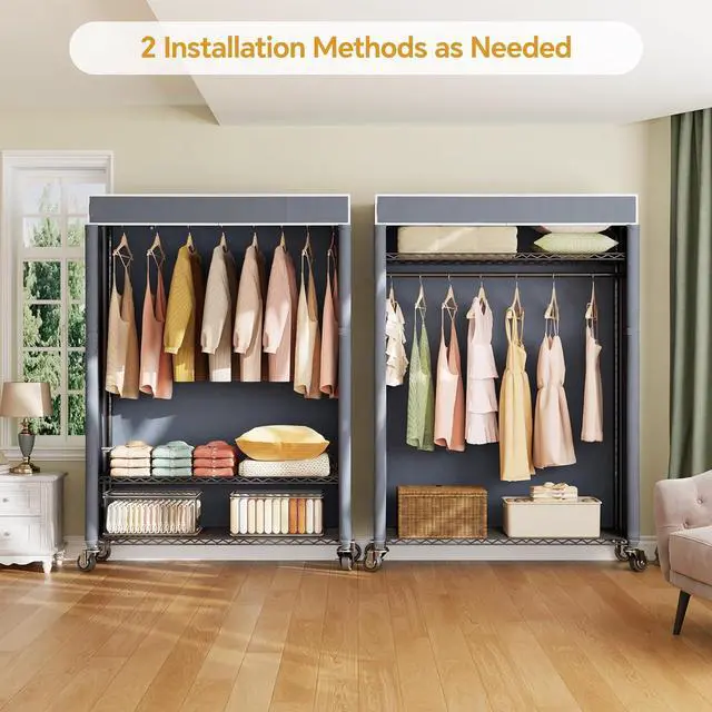 Adjustable Shelves & Dustproof Cover: Features 3 hight adjustable wire shelves, detachable hanging rods and zippered oxford fabric dustproof cover, this wardrobe closet providing versatile storage organizer. The clothing rack can be DIY, maximizing your storage space for shoes, bedding, hanging clothing, and folded clothes as a coat rack.