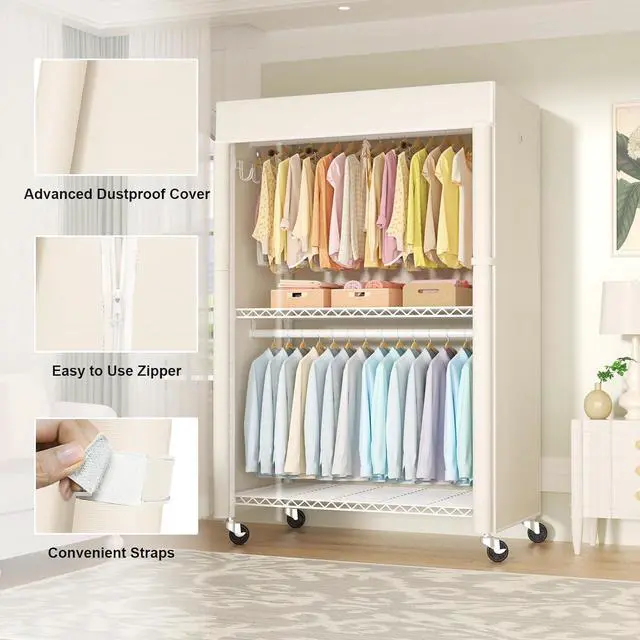 Easy to Assemble: No tools are required for easy assembly. The dustproof zippered cover is simple to tie on the garment rack